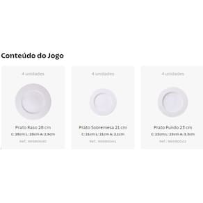 O jogo é composto por 12 peças, incluindo 4 pratos fundos de 23 cm, 4 pratos rasos de 28 cm e 4 pratos de sobremesa de 21 cm.