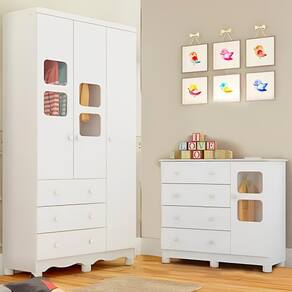 O Armário Uli 03 portas é um produto 100% MDF, sua pintura é atoxica, possui cabideiro metálico, puxadores plásticos, corrediças metálicas, pé plástico, 02 modelos de rodapé incluso e portas com PETG cristal.