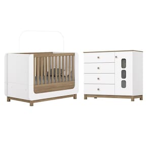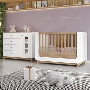 O Jogo de Quarto Infantil Aconchego com Cômoda e Berço oferece praticidade, segurança e um visual delicado para o quarto do bebê. Produzido em MDF e MDP, possui pintura UV atóxica e acabamento brilho. A cômoda conta com uma porta com prateleira interna e quatro gavetas com corrediças telescópicas, garantindo boa organização. O berço padrão americano tem bordas arredondadas, grade em MDF, duas regulagens de altura do estrado e pode ser transformado em mini cama. Certificado pelo INMETRO 003448/2024. Colchão recomendado 70 x 130 cm não incluso.