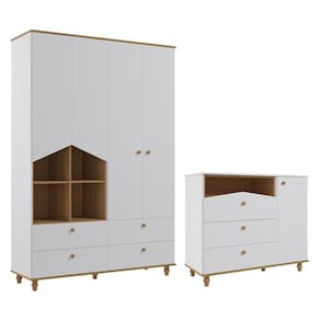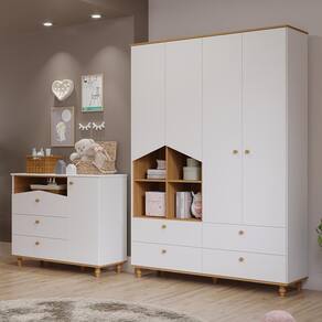 Decore o quarto do seu pequeno com o Jogo de Quarto Infantil Casinha Guarda-Roupa e Cômoda. O Guarda-Roupa tem design lúdico, portas em formato de casinha, 4 gavetas grandes e nichos laterais. Feito de MDF com acabamento atóxico. A Cômoda possui 3 gavetas grandes, nicho superior e 1 porta com prateleira interna e cabideiro. Com puxadores e pés de madeira maciça, é funcional e estilosa. Feita de MDF com acabamento atóxico.