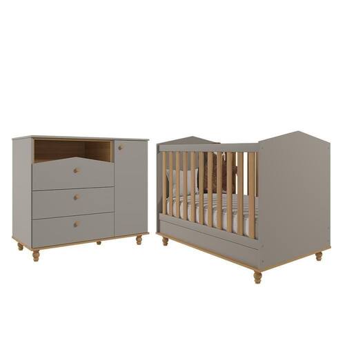 O Conjunto de Quarto Infantil é composto por uma Cômoda Casinha e o Berço Americano Mimo. A Cômoda Casinha tem um design lúdico, ideal para organizar o enxoval dos pequenos, com um nicho superior, três gavetas grandes, uma porta com prateleira interna e um cabideiro. Os puxadores e pés em madeira acrescentam charme, e a pintura é feita com materiais atóxicos. O Berço Mimo possui cabeceira em formato de casinha, pés torneados de madeira, e também é certificado feito de MDF ecológico e pelo INMETRO. Tem duas regulagens de altura e pode ser transformada em mini cama e com pés removíveis para estilo montessoriano.