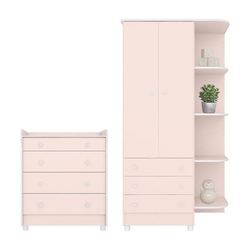 Jogo de Quarto Infantil Doce Sonho Guarda Roupa 2 Portas e Cômoda Trocador com Pés - Qmovi O Jogo de Quarto Infantil Doce Sonho, composto por um Guarda Roupa e uma Cômoda, é a escolha perfeita para ambientes compactos. O guarda-roupa, com 2 portas e 3 gavetas profundas, mais uma cantoneira prática, organiza e embeleza o espaço. A cômoda, além de suas 4 gavetas, inclui um trocador e sistema antitombamento, oferecendo funcionalidade e segurança. Ambos os móveis trazem puxadores em forma de estrela, adicionando um toque de magia ao quarto do bebê.
