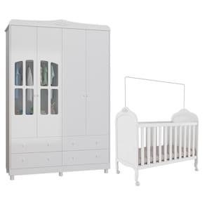 O Jogo de Quarto Infantil Elô com Janela é a escolha ideal para um ambiente seguro, prático e cheio de charme. O guarda-roupa possui estrutura em MDF com pintura UV atóxica, 4 portas (2 com janelas em PETG Cristal/Acrílico), cabideiro metálico, prateleiras, 4 gavetas com corrediças telescópicas, puxadores e pés em plástico, oferecendo ótimo espaço interno. O berço 3 em 1 pode ser utilizado como berço, mini cama ou mini sofá. Possui 3 regulagens de altura, rodízios com trava, suporte para mosquiteiro, bordas arredondadas e certificação INMETRO. Recomendado para colchão 130x70 cm (não incluso). Funcionalidade, beleza e segurança em um só conjunto.