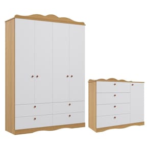 Jogo de Quarto Infantil Encanto Guarda Roupa e Cômoda - Permóbili Baby O Jogo de Quarto Infantil Encanto inclui um Guarda-Roupa e uma Cômoda. O Guarda-Roupa tem 4 portas, 4 gavetas com corrediças telescópicas, cabideiro em alumínio, várias prateleiras e nichos, garantindo ótima organização. Feito de 100% MDF, material durável e ecologicamente correto, possui acabamento em pintura UV e puxadores de plástico ABS resistentes. A moldura com curvas no estilo provençal adiciona um toque decorativo. A Cômoda tem 4 gavetas amplas, uma porta com prateleira interna e cabideiro ajustável. Feita de 100% MDF, com bordas arredondadas e pintura atóxica, oferece resistência e durabilidade e os puxadores de plástico ABS completam o design.
