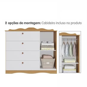 Cômoda Infantil Encanto 1 Porta e 4 Gavetas - Permóbili Baby Estrutura em MDF Fundo em HDF 2,5mm Pintura UV 1 Porta Dobradiças metálicas 4 Gavetas Corrediças telescópicas Cabideiro de alumínio Tampo com bordas arredondadas e acabamento em laca 2 Opções de montagem: prateleira removível e cabideiro Puxadores em ABS Suporta até 3Kg em cada gaveta