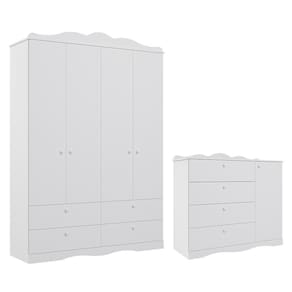 Jogo de Quarto Infantil Encanto Guarda Roupa e Cômoda - Permóbili Baby O Jogo de Quarto Infantil Encanto inclui um Guarda-Roupa e uma Cômoda. O Guarda-Roupa tem 4 portas, 4 gavetas com corrediças telescópicas, cabideiro em alumínio, várias prateleiras e nichos, garantindo ótima organização. Feito de 100% MDF, material durável e ecologicamente correto, possui acabamento em pintura UV e puxadores de plástico ABS resistentes. A moldura com curvas no estilo provençal adiciona um toque decorativo. A Cômoda tem 4 gavetas amplas, uma porta com prateleira interna e cabideiro ajustável. Feita de 100% MDF, com bordas arredondadas e pintura atóxica, oferece resistência e durabilidade e os puxadores de plástico ABS completam o design.