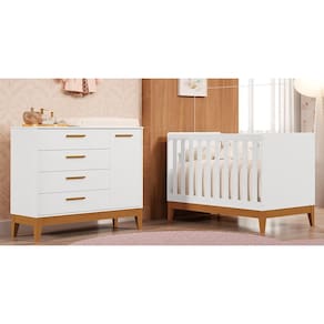 O Jogo de Quarto Infantil Flip foi pensado para oferecer praticidade, segurança e beleza ao ambiente do bebê. A cômoda é produzida em MDF com pintura UV atóxica, conta com 1 porta com dobradiças metálicas e prateleira móvel, 4 gavetas com corrediças telescópicas, puxadores revestidos, tampo com cantos arredondados, sistema antitombamento e pés de madeira. Já o berço americano, que se transforma em mini cama, possui estrutura em MDF com acabamento fosco, cabeceira arredondada, grade em madeira, 3 regulagens de altura no estrado, pés em madeira e certificado do INMETRO. Compatível com colchão de 70 x 130 cm (não incluso), é a escolha ideal para acompanhar cada fase do seu pequeno com conforto e estilo.