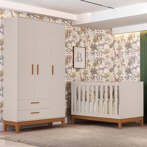 O Jogo de Quarto Infantil Flip oferece praticidade, qualidade e charme para o ambiente do bebê. O guarda-roupa é produzido em MDF com pintura UV atóxica, possui 3 portas com dobradiças metálicas, 2 gavetas com corrediças telescópicas, cabideiro em alumínio, prateleiras internas, puxadores revestidos e pés em madeira, garantindo organização e resistência. Já o berço americano, que se transforma em mini cama, conta com estrutura em MDF, acabamento fosco, cabeceira arredondada, grade em madeira, 3 regulagens de altura no estrado, pés em madeira e certificado do INMETRO. Compatível com colchão de 70 x 130 cm (não incluso), o conjunto é perfeito para acompanhar cada fase do crescimento do seu pequeno com conforto e segurança.