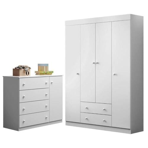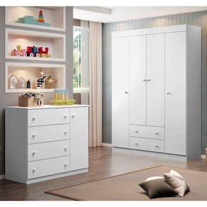 Model: Ellie | Origem: | SizeDescription: 200 x 146 x 47 cm | MaterialFamily: MDF | SupplierSimpleName: Jogo de Quarto Infantil Guarda Roupa 4 Portas e Cômoda 4 Gavetas Ellie P04 Branco - Mpozenato | ProductLength: 47 | ColorFamily: Branco | Altura: 200 cm | Color: Branco | ColorSimple: Branco | ColorSupplier: Branco | AssemblyRequired: Sim, sugerimos a contratação do nosso de montagem (para os CEPs em que o está dispon | Cor: Branco | Requere montagem: Sim | ProductWeight: 121 | Material: MDF 1215 mm | ProductContents: 1 Guarda Roupa, 1 Cômoda | OriginCountry: | Largura: 146 cm | OriginState: PR | Profundidade: 47 cm | Peso: 121 kg | ProductHeight: 200 | Gênero: Unissex | Manual: Sim | ProductWidth: 146 | ProductInstructions: Produto para uso em ambiente interno, nao devendo ficar exposto ao sol, calor e umidade excessivos. | ProductWarranty: 90 dias após o do produto