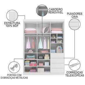 O Guarda Roupa Pérola possui 3 portas, 4 gavetas com corrediças telescópicas que deslizam de forma silenciosa e suave, cabideiro, prateleiras e nichos, com ótima divisão interna para guardar as roupas, toalhas, fraldas e brinquedos. Já a Cômoda conta com 2 portas, 4 gavetas com corrediças telescópicas e prateleiras.