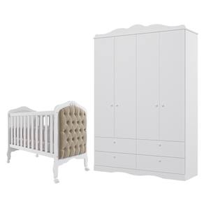 O Jogo de Quarto Infantil inclui o Guarda-Roupa Encanto e o Berço Harmonia. O Guarda-Roupa Encanto tem 4 portas, 4 gavetas com corrediças telescópicas, cabideiro em alumínio, prateleiras e nichos. Feito de 100% MDF com acabamento em pintura UV e puxadores de plástico ABS, possui moldura provençal decorativa. O Berço Harmonia é clássico e elegante, feito de MDF e certificado pelo INMETRO. Oferece segurança com duas regulagens de altura para o estrado, grades laterais fixas, 4 rodízios (2 com trava), bordas arredondadas com pintura atóxica, varão mosquiteiro e barra de proteção para transformá-lo em mini cama.