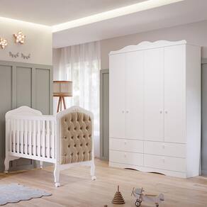 O Jogo de Quarto Infantil inclui o Guarda-Roupa Encanto e o Berço Harmonia. O Guarda-Roupa Encanto tem 4 portas, 4 gavetas com corrediças telescópicas, cabideiro em alumínio, prateleiras e nichos. Feito de 100% MDF com acabamento em pintura UV e puxadores de plástico ABS, possui moldura provençal decorativa. O Berço Harmonia é clássico e elegante, feito de MDF e certificado pelo INMETRO. Oferece segurança com duas regulagens de altura para o estrado, grades laterais fixas, 4 rodízios (2 com trava), bordas arredondadas com pintura atóxica, varão mosquiteiro e barra de proteção para transformá-lo em mini cama.