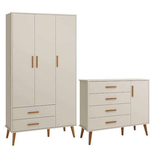 Jogo De Quarto Infantil Isis Guarda Roupa 3 Portas E Cômoda 1 Porta Areia - Reller Móveis Areia Jogo de Quarto Infantil Isis Guarda Roupa 3 Portas e Cômoda 1 Porta - Reller Móveis O Jogo de Quarto Infantil Isis é composto por um Guarda-Roupa e uma Cômoda. O Guarda Roupa Isis 3 Portas e 2 Gavetas e a Cômoda Infantil Isis 1 Porta e 4 Gavetas ambos oferecem um amplo espaço para organizar os pertences do seu bebê, seus puxadores são em madeira e suas gavetas possuem um amplo espaço interno para guardar as roupinhas do bebê dobradas. A elegância do estilo retrô aliada ao conforto. Guarda Roupa Infantil Isis 3 Portas e 2 Gavetas - Reller Móveis - Estrutura 100% MDF - Pintura UV atóxica - Acabamento fosco - 3 Portas - Dobradiças metálicas - 2 Gavetas - Corrediças telescópicas - Cabideiro metálico - Prateleira interna - Puxadores em madeira - Pés estilo retrô em madeira - Amplo espaço interno
