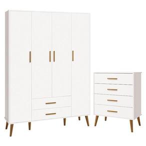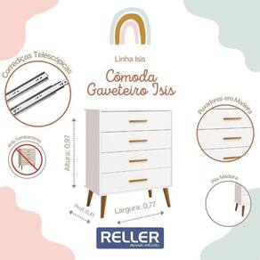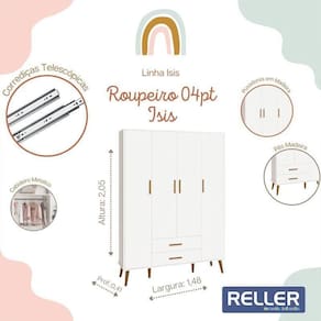 Jogo De Quarto Infantil Isis Guarda Roupa 4 Portas E Cômoda 4 Gavetas Branco - Reller Móveis Branco Jogo de Quarto Infantil Isis Guarda Roupa 4 Portas e Cômoda 4 Gavetas - Reller Móveis O Jogo de Quarto Infantil Isis é composto por um Guarda-Roupa e uma Cômoda. O Guarda Roupa Isis 4 Portas e 2 Gavetas e a Cômoda Infantil Isis 4 Gavetas ambos oferecem um amplo espaço para organizar os pertences do seu bebê, seus puxadores são em madeira e suas gavetas possuem um amplo espaço interno para guardar as roupinhas do bebê dobradas. A elegância do estilo retrô aliada ao conforto. Guarda Roupa Infantil Isis 4 Portas e 2 Gavetas - Reller Móveis - Estrutura 100% MDF - Pintura UV atóxica - Acabamento fosco - 4 Portas - Dobradiças metálicas - 2 Gavetas - Corrediças telescópicas - Cabideiro metálico - Prateleira interna - Puxadores em madeira - Pés estilo retrô em madeira - Amplo espaço interno