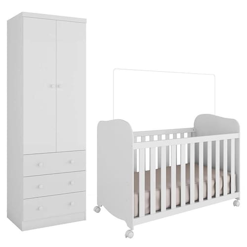 O Jogo de Quarto Infantil Júnior com Guarda-Roupa 2 Portas e Berço Uli da Móveis Peroba é uma solução prática e segura para o quarto do bebê. O guarda-roupa conta com 2 portas, 3 gavetas com corrediças telescópicas, cabideiro metálico e prateleira interna. Produzido em MDF com pintura UV atóxica, possui puxadores em plástico, pés resistentes e duas opções de rodapé: usinado ou reto. Compacto e funcional, oferece bom espaço para organização. O berço Uli possui estrutura em MDF, 3 regulagens de altura do estrado, bordas arredondadas, grades fixas e rodízios com trava. Certificado pelo INMETRO, acompanha suporte para mosquiteiro e é indicado para colchão 130 x 70 cm (não incluso). Conjunto ideal para quem busca qualidade, praticidade e um ótimo aproveitamento de espaço.