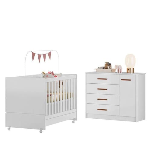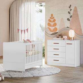 Jogo De Quarto Infantil Pérola Cômoda E Berço Branco - Peternella Móveis Branco Jogo de Quarto Infantil Pérola Cômoda e Berço - Peternella Móveis O Jogo de Quarto Infantil Pérola é composto por uma Cômoda e um Berço Mini Cama, oferecendo estilo e funcionalidade. A Cômoda Pérola é feita de MDP com acabamento em pintura UV, possui uma porta, quatro gavetas com corrediças telescópicas, prateleiras, cabideiro e puxadores revestidos em MDF. O Berço Mini Cama , em MDP e certificado pelo Inmetro, tem pintura UV, suporte para mosquiteiro, rodízios e grades fixas de MDF para segurança. Transforma-se em mini cama, acompanhando o crescimento do seu filho. Cômoda Infantil Pérola 1 Porta e 4 Gavetas - Peternella Móveis - Estrutura MDP - Pintura UV - 1 Porta - Dobradiças metálicas - 4 Gavetas - Corrediças telescópicas - Prateleira - Cabideiro - Puxadores em MDF revestido - Amplo espaço interno