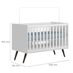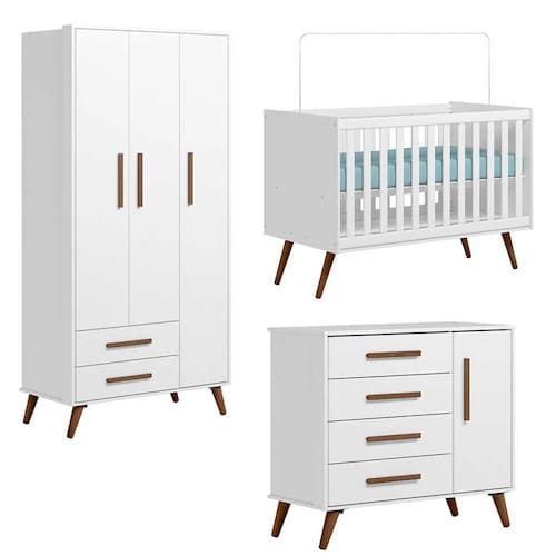 Dormitório Infantil Q Encanto Retrô Guarda Roupa, Cômoda e Berço - Qmovi O Dormitório Infantil Q Encanto Retrô é composto por um guarda-roupa, uma cômoda e um berço. O Guarda Roupa Infantil Q Encanto Retrô, foi projetado especialmente para quem precisa de um móvel espaçoso e funcional para o quarto do filho. A Cômoda Infantil Q Encanto Retrô possui quatro gavetas e uma repartição de sapateira, proporcionando mais organização para vestuário e demais objetos. Seu sistema antitombamento, garante segurança e evita acidentes. E o Berço Mini Cama Q Encanto Retrô, foi desenvolvido com todo o cuidado para garantir a segurança e conforto do bebê. O berço ainda pode ser montado como mini cama, para acompanhar o crescimento da criança. Guarda Roupa Infantil Q Encanto Retrô 3 Portas e 2 Gavetas - Qmovi • Estrutura MDP • Pintura UV • 3 Portas • Dobradiças metálicas • 6 Prateleiras • 2 Gavetas • Corrediças metálicas • Sistema antitombamento • Puxadores em MDF • Pés torneados em madeira de eucalipto design retrô • Amplo espaço interno Cômoda Infantil Q Encanto Retrô 1 Porta e 4 Gavetas - Qmovi • Estrutura MDP • Pintura UV • 1 Porta • Dobradiças metálicas • 1 Prateleira interna • 4 Gavetas • Corrediças metálicas • Sistema antitombamento • Puxadores em MDF • Pés torneados em madeira de eucalipto design retrô • Amplo espaço interno Berço Mini Cama Q Encanto Retrô - Qmovi • Estrutura em MDP • Pintura UV • Certificado compulsório do INMETRO 006 495/2021 • Padrão americano • Estrado em MDF de 6mm e travessas em MDF • Estrado regulável em três alturas: 1ª: 35,5 cm, 2ª: 48,3 cm, 3ª: 61,1 cm (altura do estrado em relação a borda superior da grade) • Pode ser transformado em mini cama • Grades fixas feitas em MDF • Acompanha suporte para mosquiteiro • Pés torneados em madeira de eucalipto design retrô • Colchão recomendado 70 x 130 cm • Não acompanha colchão Dimensões: Tamanho do Guarda-Roupa (L x A x P): 94 x 190 x 47 cm Tamanho da Cômoda (L x A x P): 94 x 84 x 42 cm Tamanho do Berço (L x A x P): 74 x 92 x 133 cm