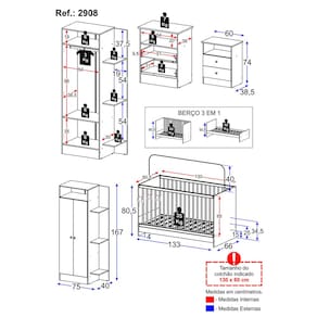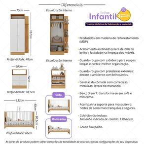 Produzido em madeira de reflorestamento (MDP) com acabamento acetinado (cerca de 20% de brilho), este quarto de bebê garante durabilidade e resistência. O guarda-roupa oferece 2 portas espaçosas, cabideiro em madeira revestido para roupas curtas e longas, além de um nicho prático e 3 prateleiras externas, garantindo organização impecável para todas as peças e acessórios do seu filho. Com sistema antitombamento, a cômoda complementa o ambiente com seu nicho multifuncional e 2 gavetas amplas, equipadas com corrediças metálicas que oferecem abertura suave. Os puxadores redondos em ABS dão um toque de delicadeza e charme ao design, tornando o quarto ainda mais aconchegante.