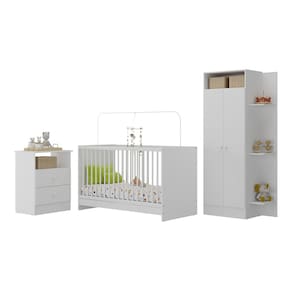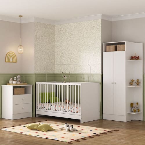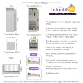 Produzido em madeira de reflorestamento (MDP) com acabamento acetinado (cerca de 20% de brilho), este quarto de bebê garante durabilidade e resistência. O guarda-roupa oferece 2 portas espaçosas, cabideiro em madeira revestido para roupas curtas e longas, além de um nicho prático e 3 prateleiras externas, garantindo organização impecável para todas as peças e acessórios do seu filho. Com sistema antitombamento, a cômoda complementa o ambiente com seu nicho multifuncional e 2 gavetas amplas, equipadas com corrediças metálicas que oferecem abertura suave. Os puxadores redondos em ABS dão um toque de delicadeza e charme ao design, tornando o quarto ainda mais aconchegante.