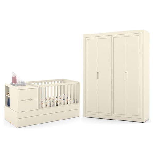 O Jogo de Quarto Infantil Tutto New conta com design moderno e funcional, é composto por um lindo Guarda-Roupa com amplo espaço interno e ótimas divisões para organizar as roupinhas e acessórios, e um Berço Multifuncional que conta com trocador, gaveteiro e cama auxiliar, inclusos no mesmo móvel. E não para por aí, ele acompanha o desenvolvimento do seu filho se transformando em uma linda mini cama. O quartinho do bebê será único, completo e especial com essa combinação.