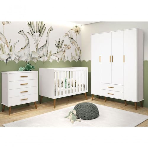 Jogo De Quarto Retrô Para Bebê Completo 4 Portas Isis Branco Fosco - Moveisaqui O Jogo de Quarto Retrô para Bebê Completo 4 Portas Isis - MóveisAqui, é ideal para o quartinho do seu baby. Seus pés em madeira maciça proporcionam o ar retrô, as peças detém um desing clean que harmonizam com vários estilos de decoração. Contempla um Berço que exala personalidade e delicadeza, podendo trnasformar-se em mini cama futuramente, uma Cômoda Gaveteira com quatro gavetas, e um Roupeiro de quatro portas e duas gavetas, amplos, espaçosos e com divisórias internas, são perfeitos para a organização das roupinhas e itens do seu bebê.Dimensões do Produto Montado-Berço:Altura: 94 cmLargura: 133 cmProfundidade: 77 cmObservações:- Berço Certificado pelo INMETRO 009882/2022;- Transforma-se em mini cama;- Padrão Americano;- Acompanha suporte de mosquiteiro;- 03 regulagens de altura do estrado;- Colchão Recomendado: 130cm x 70cm x 12cm Densidade: D18 (colchão não incluso);- Pés na cor Madeira;- Pintura ultravioleta com acabamento ões do Produto Montado-Cômoda Gaveteira:Altura: 97 cmLargura: 77 cmProfundidade: 41 cmObservações:- 04 gavetas;- Produzida em MDF;- Corrediças Telescópicas;- Puxadores em MDF;- Sistema anti Tombamento;- Pés na cor Madeira;- Pintura ultravioleta com acabamento ões do Produto Montado-Roupeiro:Altura: 205 cmLargura: 148 cmProfundidade: 41 cmObservações:- 04 Portas;- 02 Gavetas;- Cabideiro Metálico;- Corrediças Telescópicas;- Sistema anti Tombamento;- Puxadores em MDF;- Pés na cor Madeira;- Pintura ultravioleta com acabamento fosco. Marca: Não Informado
