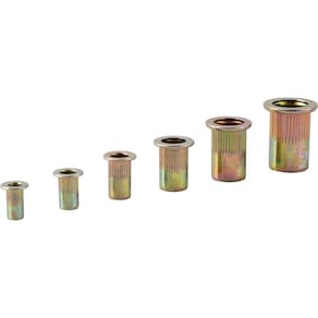 Tipo de rebites: Rebite com rosca | Material do corpo: Aço carbono | Acabamento: Zincado | Diâmetro do furo indicado: M3 (5,1 mm); M4 (6,1 mm); M5 (7,1 mm); M6 (9,1 mm); M8 (11,1 mm); M10 (13,1 mm). | Espessura da chapa indicada: M3 (0,5 mm a 2,0 mm); M4 (0,5 mm a 2,0 mm); M5 (0,5 mm a 2,5 mm); M6 (0,5 mm a 3,0 mm); M8 (0,5 mm a 3,5 mm); M10 (0,5 mm a 3,5 mm). | Observação: M3 ao M10 com 150 peças.
