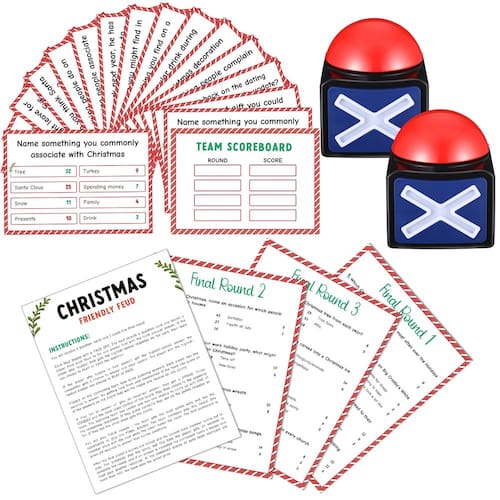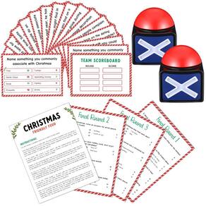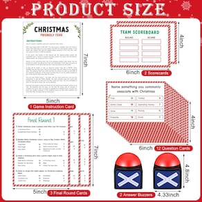 Características: Eleve suas reuniões de férias com nosso jogo de rivalidade familiar de Natal! O jogo apresenta regras abertas para um jogo suave e inclui duas campainhas para manter as coisas organizadas. Um papel de anfitrião dedicado melhora a interação, enquanto os gráficos vibrantes o tornam uma escolha de destaque para o Natal. Tamanho: A carta de introdução do jogo e a carta redonda final: 15 x 10 cm O cartão de pontuação e o cartão de perguntas: 17,8 x 12,7 cm A embalagem inclui: 1 x manual de instruções (sem garantia de versão em português). 2 cartões de pontuação. 12 cartões de perguntas. 3 cartas de jogo finais rápidas. 2 buzzers de resposta (pilhas não incluídas) Observações: Medição manual, considere pequenos erros no tamanho. A cor pode existir uma pequena diferença devido a diferentes telas. Nosso produto é adequado para pessoas com mais de 14 anos de idade. - Conjunto de jogo de feud amigável de Natal: este jogo de cartas de feud de Natal inclui 1 carta de instruções do jogo, 2 cartas de pontuação, 12 cartas de perguntas e 3 cartas de jogo final rápidas, 18 cartas no total no pacote, tudo o que você precisa para um divertido teste de perguntas e respostas de festa de Natal está incluído - Campainhas de jogo: o jogo de rivalidade familiar para adultos com campainha tem regras abertas e instruções fáceis de seguir para garantir um jogo suave; as duas campainhas incluídas alimentadas por 4 baterias (não incluídas) e pressione as campainhas vermelhas para acender e fazer som, o que ajuda a manter o jogo organizado e divertido, tornando-o uma boa adição à sua noite de jogo em família - Material de qualidade: todas as cartas de jogo de feud são feitas de papel de qualidade para garantir uma impressão nítida, não é fácil de desbotar e reutilizável; cada cartão de jogo é cuidadosamente projetado, não apenas bonito, mas também pode adicionar uma atmosfera alegre às suas férias; e você pode aproveitar este jogo em sua festa de férias, se divertir com sua família e amigos e criar boas memórias - Tamanhos de cartas convenientes: com dimensões de cartas de 18 x 12 cm e 15 x 10 cm, este jogo de cartas de feudo de Natal oferece fácil de jogar, e instruções detalhadas do jogo estão incluídas no pacote - Artigos de festa: o jogo de rivalidade familiar de férias é adequado para atividades familiares, festa de ação de graças, festa de Natal, festa de ano novo e outras festas de fim de ano, o que trará diversão ilimitada para você e sua família ou grupos; e o design bonito e ampla ampla variedade de aplicações também o tornam uma escolha versátil para melhorar qualquer festa ou noite de jogo em família