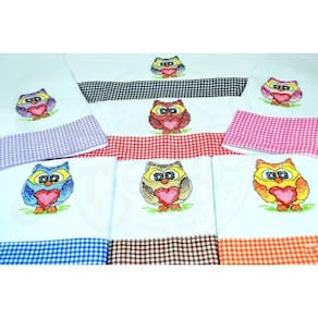 Jogo fabricado em tecido branco 100% algodão, com simpáticas corujinhas coloridas bordadas em ponto cruz, e com barrados de diversas cores como lilás, marrom, vermelho, azul, laranja, preto.