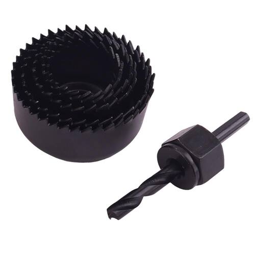 O jogo conta com 05 serra-copo de diferentes diâmetros e 01 suporte adaptador com broca: