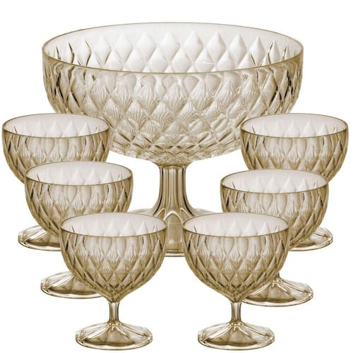 Kit de sobremesa composto por 1 taça de 1,9 litros (C:20,4 x L:20,4 x A:15,2 cm) e 6 taças de 350ml (C:10,5 x L:10,5 x A:11,5 cm). São fabricados em poliestireno (idêntico ao acrílico) e parecem vidro. São leves e resistentes. Todos os produtos são na cor âmbar e se combinam.Atenção:- Não pode ser levado ao micro-ondas;- Não pode ser lavado na lava-louças;- Sugerimos que a lavagem seja feita com o lado macio da esponja.Fabricante: Plasutil