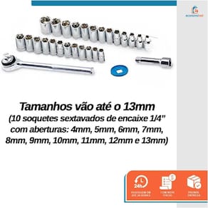 10 Soquetes sextavados de encaixe 1/4" (6,35mm) com aberturas: 5/32” (3,97mm), 3/16” (4,76mm), 7/32” (5,56mm), 1/4” (6,35mm), 9/32” (7,14mm), 5/16” (7,94mm), 11/32” (8,73mm), 3/8” (9,53mm), 13/32” (10,32mm) e 7/16” (11,11mm).
