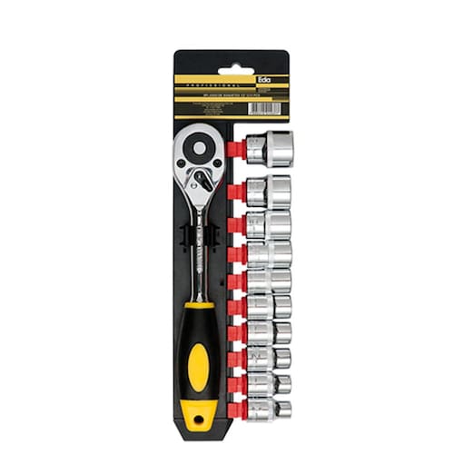 Jogo de soquetes enc 1/2" com 11 peças mm 9pi - eda Soquetes 1/2" com catraca emborrachada com 11 peças em aço cromo vanádio 9pi eda O jogo contém 11 soquetes e uma chave de catraca em aço cromo vanádio. Peças profissionais e que acompanham suporte para transporte e armazenamento. - marca: eda - modelo: 9pi - jogo em aço cromo vanádio - com 10 soquetes: 10, 11, 12, 13, 14, 15, 17, 19, 22 e 24 mm - com chave catraca de 1/2" - peças em aço cromo vanádio - com cabo emborrachado - acompanham suporte - comprimento da chave: 26 cm 10" - peso bruto: 1,3 kg - : 90 dias