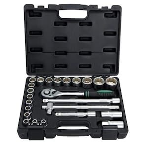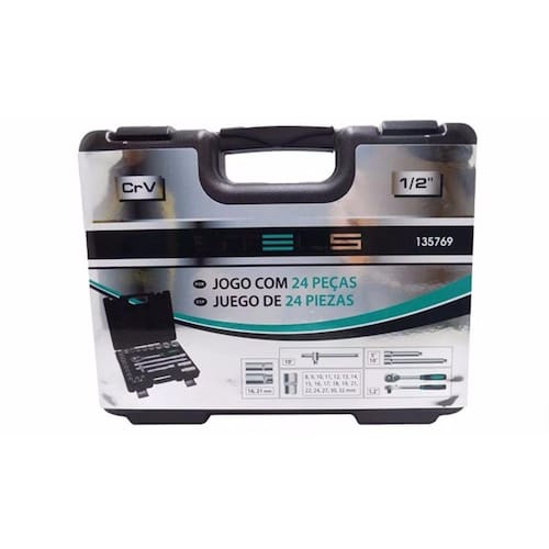DescriçãoSoquetes estriados de até 32mm, extensão, chave catraca, cabo T, todos com encaixe de 1/2".Dados TécnicosEncaixe: 1/2"Material: Aço Cromo VanádioProdutos de excelente qualidade, soquetes e chaves em Aço CR-VSoquetes 1/2" com boca estriadaCatraca reversível com cabo emborrachadoMaleta resistenteItens Inclusos Na Caixa1 Chave catraca reversível 1/2" com cabo emborrachado1 Barra extensora de 10"1 Barra extensora de 5"1 Chave de vela soquete sextavado longo de 21mm1 Chave de vela soquete sextavado longo de 16mm1 Cabo T ajustável 1/2"18 Soquetes estriados 1/2": 8, 9, 10, 11, 12, 13, 14, 15 ,16, 17, 18, 19, 21, 22 ,24, 27, 30 e 32mm1 Maleta com design inovador ultra resistenteGarantia de 03 meses, oferecida pelo fabricante.