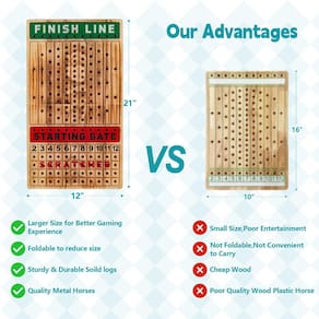 1 - ?Conjunto de jogo de tabuleiro de alta qualidade?Nossos produtos são feitos de madeira maciça de alta qualidade, com artesanato requintado e acessórios completos. O produto inclui um tabuleiro de jogo dobrável (com um tamanho dobrável de 26,5 x 30,5 x 4,2 cm e um tamanho desdobrado de 53 x 30 x 2 cm), um conjunto de cavalos de metal (4 dourados, 4 ouro rosa, 3 cinza prateado), duas cartas de baralho e uma bolsa de armazenamento. O conjunto completo de equipamentos oferece a você uma melhor experiência de jogo. - ?Design dobrável economiza espaço?Nosso produto é diferente dos tabuleiros comuns de corrida de cavalos, pois adota um design dobrável. O tabuleiro de jogo desdobrado é grande o suficiente para facilitar o jogo. Quando você não estiver jogando, você pode dobrá-lo para armazenamento e economizar espaço. Além disso, o design dobrável torna mais conveniente para levar e brincar, seja acampando ou viajando, pode trazer diversão ilimitada para você, sua família e amigos. - ?Técnicas de produção requintadas?Nosso produto é feito de madeira natural de alta qualidade, usando equipamentos de alta qualidade para cortar tabuleiros de jogo e empregando técnicas avançadas de escultura e impressão para garantir a distribuição uniforme de furos e cores brilhantes. A superfície do tabuleiro de jogo tem um revestimento à prova d'água, que pode proteger melhor o tabuleiro de danos e é resistente e durável. Também usamos cavalos de metal luxuosos para combinar com este jogo, tornando-o mais esteticamente agradável em geral. - ?Adequado como presente?Nossos produtos têm alta qualidade, design requintado e equipamento completo. Ao mesmo tempo, também o equipamos com uma embalagem colorida e, quando você recebê-lo, certamente ficará maravilhado com sua aparência requintada. Este jogo recebeu ampla popularidade, não apenas adequado para brincar com a família e amigos em festas, mas também como um presente para familiares e amigos. - ?Garantia pós-venda?Estamos comprometidos em fornecer aos clientes produtos e serviços de alta qualidade. Cada um dos nossos produtos é de alta qualidade, e nós os embalaremos cuidadosamente para que você os entregue com segurança em suas mãos. Se você tiver alguma insatisfação com o produto que recebeu, para ajudá-lo a resolvê-lo. Vamos nos esforçar para resolver todas as suas preocupações.