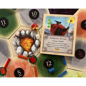 Um Golem Elemental foi invocado e está causando estragos em toda a ilha. Você pode lançar proteções mágicas suficientes para salvar seus assentamentos? Quando um 7 é lançado, o Golem Elemental é invocado e começa seu caminho de destruição. O jogador que acertou o 7 colocará o Golem Elemental em um hexágono terrestre de sua escolha. Qualquer feitiço com um Golem Elemental não produz mais recursos e os jogadores criados com base nesse hexágono perdem 1 recurso para o Elemental, devolvendo 1 recurso de sua escolha para o banco. Uma vez que o Golem Elemental é colocado, ele imediatamente entra em fúria. - Feito nos EUA - Feitiço de Invocação Elemental personalizado - Golem Elemental Meeple de madeira - Cartão de bônus Elemental Wizard - Tokens de proteção mágica