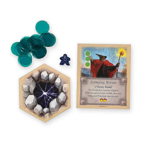 Um Golem Elemental foi invocado e está causando estragos em toda a ilha. Você pode lançar proteções mágicas suficientes para salvar seus assentamentos? Quando um 7 é lançado, o Golem Elemental é invocado e começa seu caminho de destruição. O jogador que acertou o 7 colocará o Golem Elemental em um hexágono terrestre de sua escolha. Qualquer feitiço com um Golem Elemental não produz mais recursos e os jogadores criados com base nesse hexágono perdem 1 recurso para o Elemental, devolvendo 1 recurso de sua escolha para o banco. Uma vez que o Golem Elemental é colocado, ele imediatamente entra em fúria. - Feito nos EUA - Feitiço de Invocação Elemental personalizado - Golem Elemental Meeple de madeira - Cartão de bônus Elemental Wizard - Tokens de proteção mágica