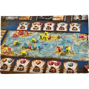 Tiny Epic Vikings é um jogo de tabuleiro de estratégia de 1 a 4 jogadores que combina desenho, controle de área e coleção de conjuntos. O objetivo do jogo é acumular mais pontos após 3 eras, ganhando o favor dos deuses mais poderosos. Em Tiny Epic Vikings, os jogadores lideram um Clã dos Vikings ao longo de 3 eras, na esperança de reivindicar as terras geladas por conta própria. Eles escolhem os melhores construtores, colheitadeiras, exploradores e guerreiros jogando cartas vikings que representam os líderes de seu clã. Invada e conquiste as ilhas com colonos, construa barcos e templos para ganhar influência e lutar pelo favor dos deuses. Ganhe o favor dos deuses para garantir sua vitória. Para colocar sua estratégia em ação, use os vikings em cada rodada. Navegue com seus navios. Batalha por território e glória. Reúna pedras rúnicas da terra para inspirar seu povo e glorificar os deuses. As runas nos jogos de tabuleiro são todas triplas codificadas com cores diferentes, símbolos de runas e também formas diferentes. (as cores vermelha e verde do jogador, por outro lado, podem representar um desafio, dependendo do tom final das cores usadas). Minha única crítica a essas cartas é que os ícones no saco são relativamente pequenos, a madeira tem um fundo marrom e o aço tem um fundo cinza, mas ambos parecem uma pequena pilha de blocos, então acho que seria bom se fossem um pouco maiores. O que está incluído na caixa Tiny Epic Vikings: Tabuleiro de mapa dupla face, 48 cartas viking, 18 cartas de favor, 6 tapetes de Deus, 1 tapete de era/pontuação, 24 colonos, 16 barcos (4 em 4 cores de jogador), 8 têmporas (2 em 4 cores de jogadores) 4 marcadores de pontuação 9 runas (3 em 3 tipos) 3 marcadores de fúria 13 Villages 12 Marcadores de recursos (4 em 3 tipos) 1 marcador Raven 1 Chieftain - JOGABILIDADE PEQUENA ÉPICA VIKINGS: O jogo leva 3 épocas. Cada era é dividida em três fases (rascunho, ações e limpeza). Dê a cada jogador o número de cartas indicado no tapete da era durante a fase de elaboração. Realizar ações é a maior parte do jogo. Você joga uma carta a cada turno, virado para baixo para a batalha ou virado para cima por suas ações. Você ganha pontos com base em suas runas no final da terceira era. - Tabuleiro real: Tiny Epic Vikings é o primeiro jogo da série a usar um tabuleiro em vez de jogos de cartas grandes. O quadro é simplesmente uma dobra tripla, um retângulo largo sobre a largura e altura da caixa. É dupla face, com um lado dedicado ao jogo de 4 jogadores e o outro a todas as outras contagens de jogadores. - Estratégia de esboço e controle de área: em Tiny Epic Vikings, os jogadores lideram um clã dos vikings em 3 eras com a estratégia de "Drafting, controle de área e coleção de conjuntos", na esperança de reivindicar as terras geladas por conta própria. Eles jogam cartas vikings e selecionam vikings em cada rodada para realizar o plano. Ao jogar cartas viking, os líderes de seu clã, eles escolhem quais construtores, colheitadeiras, exploradores e guerreiros são os melhores. Com os colonos, guerreiros vikings invadem e conquistam as ilhas. - CARTAS FAVOR CONCEDEM A VOCÊ RUNAS: As cartas de favor são do tamanho médio, com uma ou duas runas na parte superior e um "saco" de ícones de recursos abaixo. As runas do jogo são todas triplas codificadas em cores diferentes, diferentes símbolos de runas e também formas diferentes, de modo que isso não deve ser um problema para jogadores daltônicos. - Ganhe FAVOR COM OS DEUSES PARA SEGURAR SUA VITÓRIA: Em pequenos vikings épicos, os jogadores comandam um clã de vikings em 3 eras na esperança de reivindicar as terras geladas para si mesmos. Eles escolhem os melhores construtores, colheitadeiras, exploradores e guerreiros jogando cartas viking que representam os líderes de seu clã.