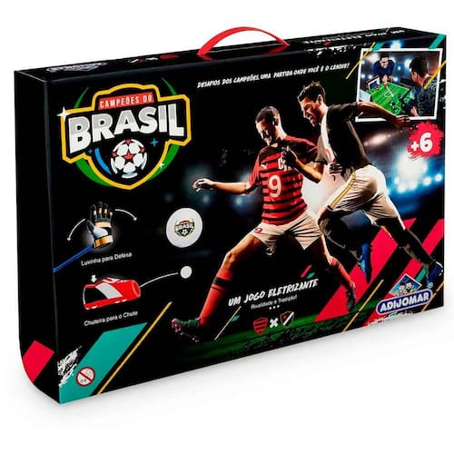 Jogo de Tabuleiro - Gol a Gol - Campeões do Brasil - Adijomar: Brasileiro já nasce apaixonado pelo futebol, já que não é possível estar dentro do campo para dar uma forcinha nas jogadas, por que não levar essa competição tão amada para sua casa? Com o jogo Gol a Gol Campeões do Brasil isso é possível. Teste sua habilidade e criatividade e desafie seus amigos e prove que você é o melhor! É preciso ter bastante agilidade e sincronia. Uma coisa é garantida: essa partida vai ser cheia de emoção! Da uma olhadinha nesses diferenciais: - Prático, intuitivo e divertido - Visual único inspirado nos campos de futebol brasileiros - Acompanha luvinha para defesa - Chute com tudo com sua chuteira - Partida inovadora, desafiadora e divertida - Materiais confeccionados de alta qualidade - Garante a brincadeira e o desenvolvimento da percepção e reflexos - Caixa irada e criativa, traz a emoção dos estádios a sua casa Informações: • Produto: Campeões do Brasil • Marca: Adijomar • Material do Produto: Plástico e PVC • Tipo: Jogo de futebol de mesa • Conteúdo: 01 Tabuleiro Campeões do Brasil, 02 Luvas, 02 Varetas de 30 cm, 02 Chuteiras, 06 Bolinhas e 2 Arquibancadas • Recomendação: para crianças a partir de 06 anos de idade Especificações: • Referência: 0904 • Código de Barras: 7897020209048 • Embalagem (C x A x L): 50 x 32 x 10 cm • Embalagem (Peso): 1.050 kg • Registro: CE-BRI/ICEPEX-N 01262-14 • Certificado: Órgãos Autorizados - OCP´S (Organismos de Certificação de Produtos) BENEFÍCIOS DE BRINCAR: - Eleva a autoestima - Exercita a memória - Estimula o raciocínio - Exercita o imaginário - Desenvolve a criatividade - Desenvolve percepção visual - Desperta a atenção e curiosidade - Desenvolvimento neuropsicológico - Estimula habilidades motoras básicas - Incentiva a comunicação e linguagem - Desenvolve aspectos emocionais e afetivo - Estimula o reconhecimento de formas e cores Aviso: - As imagens são meramente ilustrativas - Os tamanhos e medidas são aproximados - As cores e estampas dos produtos podem ter variações - As informações são de responsabilidade do fabricante ou fornecedor