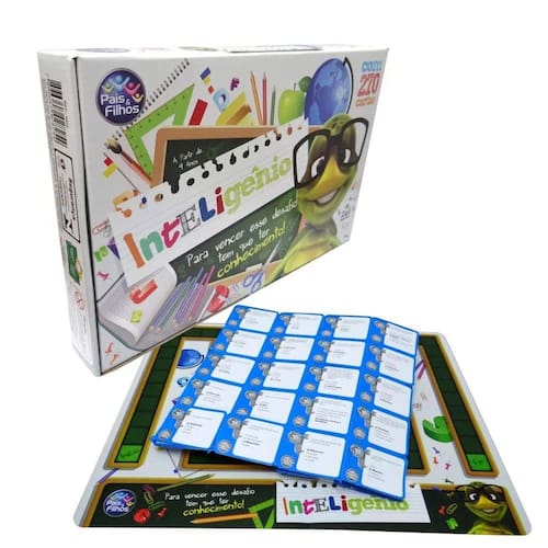 Inteligênio, De 2 A 6 Jogadores. Tire Na Sorte Quem Começará O Jogo. Cada Jogador Deverá Escolher A Cor Do Seu Peão. O Jogador Que Estiver À Esquerda Do Jogador Da Vez Deve Pegar Uma Carta E Ler A Pergunta Em Voz Alta. Somente O Jogador Da Vez Pode R ponder, se acertar, anda uma casa, se errar, permanece no mesmo lugar. Vence quem chegar primeiro à casa com a palavra FIM. Caixa contendo 1 tabuleiro, 6 peões plásticos e 270 cartas.