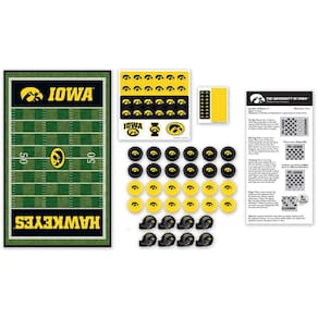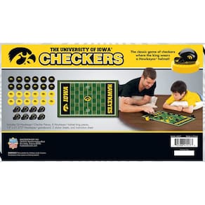 MasterPieces Jogo de tabuleiro NCAA Iowa Hawkeyes Checkers, 33 cm x 53 cm - Produto universitário oficialmente licenciado - O jogo inclui 24 peças de damas, 8 peças de capacete de futebol americano, tabuleiro de jogo de 33 x 53 cm, folha de adesivos e folha de instruções - Coroe seu xadrez king com um capacete Iowa que se encaixa firmemente no lugar - Dirija suas damas pelo campo de futebol em um tabuleiro de xadrez realista com zonas de extremidade coloridas do time