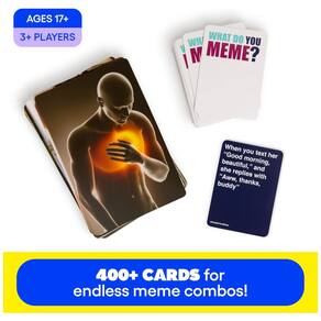 Como jogar Compita com seus amigos e familiares para criar os memes mais engraçados. Faça isso usando uma de suas cartas de legenda distribuídas para legendar a carta de foto em cada rodada. Escolha do Juiz O vencedor de cada rodada é decidido por um juiz rotativo. Dica profissional escolha seu cartão de legenda para combinar com o senso de humor do juiz. The OG Este é o jogo principal, então compre o primeiro. Você precisará dele para todos os nossos outros pacotes de expansão. Projetado para maiores de 17 anos este jogo contém conteúdo adulto e foi desenvolvido para maiores de 17 anos. Incentivado a ser jogado com 3 jogadores. Conteúdo Cada jogo principal do What Do You Meme contém 435 cartas. 360 deles são cartões de legenda e 75 são cartões de foto. Impresso em cartas de baralho premium espesso com acabamento brilhante inclui um cavalete e regras de bônus, embaladas em uma caixa personalizada. Mais hilaridade também fazemos outros jogos de festa inspirados na cultura pop. Confira nossa loja para toneladas de mais coisas boas Marca: Não Informado