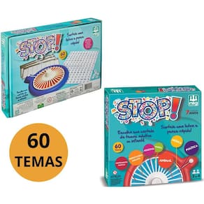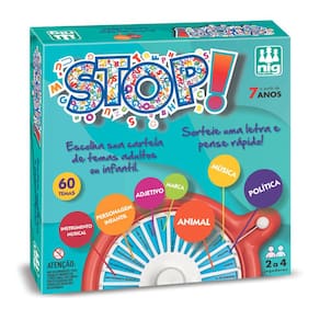 JOGO DE MESA STOP 60 TEMAS NIGO tradicional jogo STOP ficou mais emocionante com os temas sendo sorteados em uma roleta de plástico. São dois discos diferentes (adulto e infantil) com 60 sugestões para você quebrar a cabeça Também acompanha blocos para preencher com as palavras e anotação de pontos.EspecificaçõesParticipantes: 2 a 4Idade Recomendada: A partir de 07 anosItens Inclusos01 Roleta02 Discos de papel com temas01 Cartela para preenchimento01 Cartela com letras descartáveis01 Saco plásticoPeso e Dimensões Aproximadas do produto na caixa:Largura: 28 cm. Altura: 28 cm. Profundidade: 7 cm.Peso: 365 g.