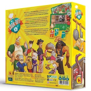 Jogo de Tabuleiro The Cook-Off Papergames Bem-vindo ao The Cook-Off, o aclamado torneio onde cozinheiros internacionalmente famosos disputarão o posto de melhor Chef de Cozinha A cada rodada do concurso, escolha suas ações e prepare suas melhores receitas, cozinhando carnes e vegetais, enquanto se defende das trapaças e sabotagens dos seus concorrentes como moscas, laxante, pimentas e parafusos, jogados discretamente em suas panelas E lembre-se: você também pode sabotar os pratos dos outros participantes Após 10 rodadas de receitas, o cozinheiro que terminar com mais pontos vence o concurso e a partida . COMPONENTES: 7 Tabuleiros de Jogador1 Tabuleiro de Pontos e Rodadas49 Cartas de Ações59 Fichas de Vegetais36 Fichas de Carne15 Fichas de Sabotagem7 Fichas de Personagem1 Ficha de Rodada1 Menu de Regras FICHA TÉCNICA:Idade: 8+;Jogadores: 2 a 7;Duração: 30 minutos;Sleeve: 49 45.0 mm X 68.0 mm Categoria: seleção de Ação Simultânea, Apostas e Blefes, Gerenciamento de Mãos, Toma Essa, Vazas/Truques, Movimento Programado, Colecionar ConjuntosMecânicas: Ação Simultânea, Leilão, Gestão de Mão, Blefe;Temas: GastronomiaIdioma: Português Br.Homologação Inmetro: CE-BRI/IQB 005923 53374/19-038