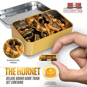 Como os americanos compraram carros em números recordes na década de 1950, as ferrovias tentaram atrair passageiros de volta com trens a diesel luxuosos e "futuristas". Nosso trem Hornet foi influenciado por esses designs clássicos de locomotivas a diesel de meados do século. A arte de lata do Hornet imita o estilo Norman Rockwell dos anúncios de trem americano dos anos 1950. - Oficialmente licenciado - Contém 48 trens e 1 marcador de pontuação empilhável - Feito de plástico - Vem em uma lata para facilitar o armazenamento e transferência!