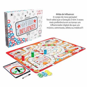 Jogo de Tabuleiro - Vida de Influencer - Pais e Filhos: o jogo da geração Z! Será que você consegue atingir 1 milhão de inscritos? Viva a vida de um influencer, nesse jogo em que quem vence não é quem chega primeiro, mas quem consegue mais seguidores. Como jogar Vida de Influencer, da Pais e Filhos? • Preparação: - Cada jogador deve escolher seu peão/celular e personalizar a tela com a canetinha, que acompanha o jogo (caneta dry eraser) - A ordem dos jogadores pode ser definida no dardo • Objetivo: - Chegar ao final do circuito com o maior número de seguidores possível. Quem chegar ao final com 1 milhão de inscritos, ou mais, ganha a tão sonhada placa de 1 milhão de inscritos • Jogando - Cada participante deve jogar o dado e movimentar o peão a quantidade de casas indicadas no dardo - Para ganhar ou perder inscritos depende de diversas situações do jogo. - O jogo termina apenas quando todos chegarem ao final. O primeiro que chegar, ganha 100 mil seguidores até todos os outros participantes chegarem Informações: • Produto: Jogo Vida de Influencer • Marca: Pais e Filhos • Tipo: Jogo Infantil • Categoria: Jogos e Tabuleiros • Jogadores: até 04 jogadores • Objetivo: Chegar ao final do tabuleiro com o maior número de seguidores • Conteúdo: - 01 regra - 01 tabuleiro - 01 dado - 01 tablet roleta - 01 caneta dry erases - 01 flanela apagador - 04 placas de 1 milhão de inscritos - 224 fichas de seguidores • Recomendação: para crianças a partir de 07 anos de idade Especificações: • Referência: 10867 • Código de Barras: 7896647008676 • Embalagem (C x A x L): 44.5 x 32.5 x 06 cm • Embalagem (Peso): 0.906 kg • Material / Composição: Papel Cartão, Polietileno e Tecido (Felty) • Selo do INMETRO: CE-BRI/ICEPEX-N 01264-25 • Registro: 03769/2019 • Certificado: Órgãos Autorizados - OCP´S (Organismos de Certificação de Produtos) Benefícios de brincar e jogar: • Eleva a autoestima • Exercita a memória • Estimula o raciocínio • Exercita o imaginário • Desenvolve a criatividade • Desenvolve percepção visual • Desperta a atenção e curiosidade • Desenvolvimento neuropsicológico • Estimula habilidades motoras básicas • Incentiva a comunicação e linguagem • Desenvolve aspectos emocionais e afetivo • Estimula o reconhecimento de formas e cores Aviso: • As imagens são meramente ilustrativas • Os pesos, tamanhos e medidas são aproximados • As cores e estampas dos produtos podem ter variações • As informações são de responsabilidade do fabricante ou fornecedor