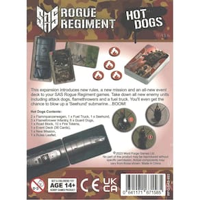 Word Forge Games: SAS Rogue Regiment - Expansão Hot Dogs - Jogo de tabuleiro de estratégia, Ação Stealth da Segunda Guerra Mundial, Tema Militar, Idades 14+, 1-4 jogadores, 60 min - Soldados SAS travam uma guerra de guerrilha atrás das linhas inimigas neste jogo de ação furtivo da 2ª Guerra Mundial para 1-4 jogadores. - 4 cães de guarda – desovando na seção de batalha ou colocados adjacentes a guardas com um mecânico de detecção de "cheiro", os cães rastrearão os operadores mesmo quando não forem vistos. - 2x Infantaria Lança-chamas – as unidades de chamas precisam se aproximar, mas além dos danos pesados que causam, elas incendiam edifícios, forçando os operadores a saírem da cobertura. - 2 objetivos relacionados ao combustível prontos para seus operadores demolirem.