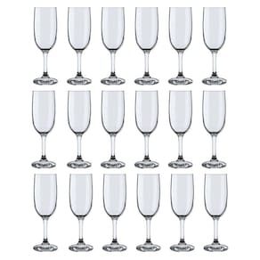 Informações complementares: Modelo: Champagne Cor: Transparente Material: Vidro Capacidade: 180ML Peso: 162G (Cada Unidade) Altura: 18CM Diâmetro da boca: 5CM Itens inclusos: Conjunto com 18 Taças