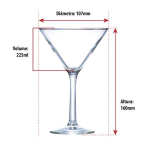 Indicado para: Martini. Material: Vidro. Capacidade: 225ml. Conteúdo da Embalagem: 1 Peça. Medidas: Diâmetro 107mm x Altura 160mm.