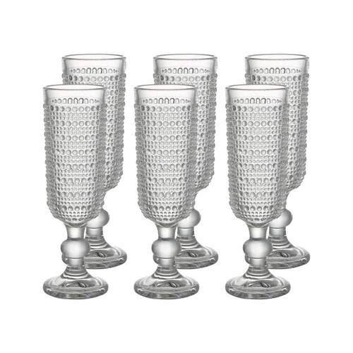 Característica-1 - DIFERENCIAIS: o Conjunto de Taças para Espumante 6 Peças 150 ml da Linha Esfera/Haus Concept é fabricado em vidro decorado com esferas, deixando os Taças com um design vintage e sofisticado. São Taças perfeitas para o dia a dia e ocasiões especiais, para servir à mesa ou decorar, trazendo ainda mais requinte para sua casa. São as taças ideais para a degustação de champanhe, espumantes e frisantes, preservando as borbulhas, aromas e sabores. Além de ser uma ótima opção para apresentar verrine.