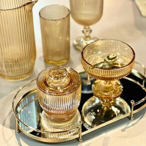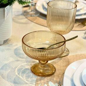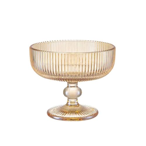 Elegância Duradoura: Com desenhos em relevo listrados e a cor âmbar vibrante, essas taças são ideais para servir sobremesas com um toque de sofisticação. Seu design minimalista e atemporal harmoniza facilmente com outros itens de sua mesa ou cristaleira.